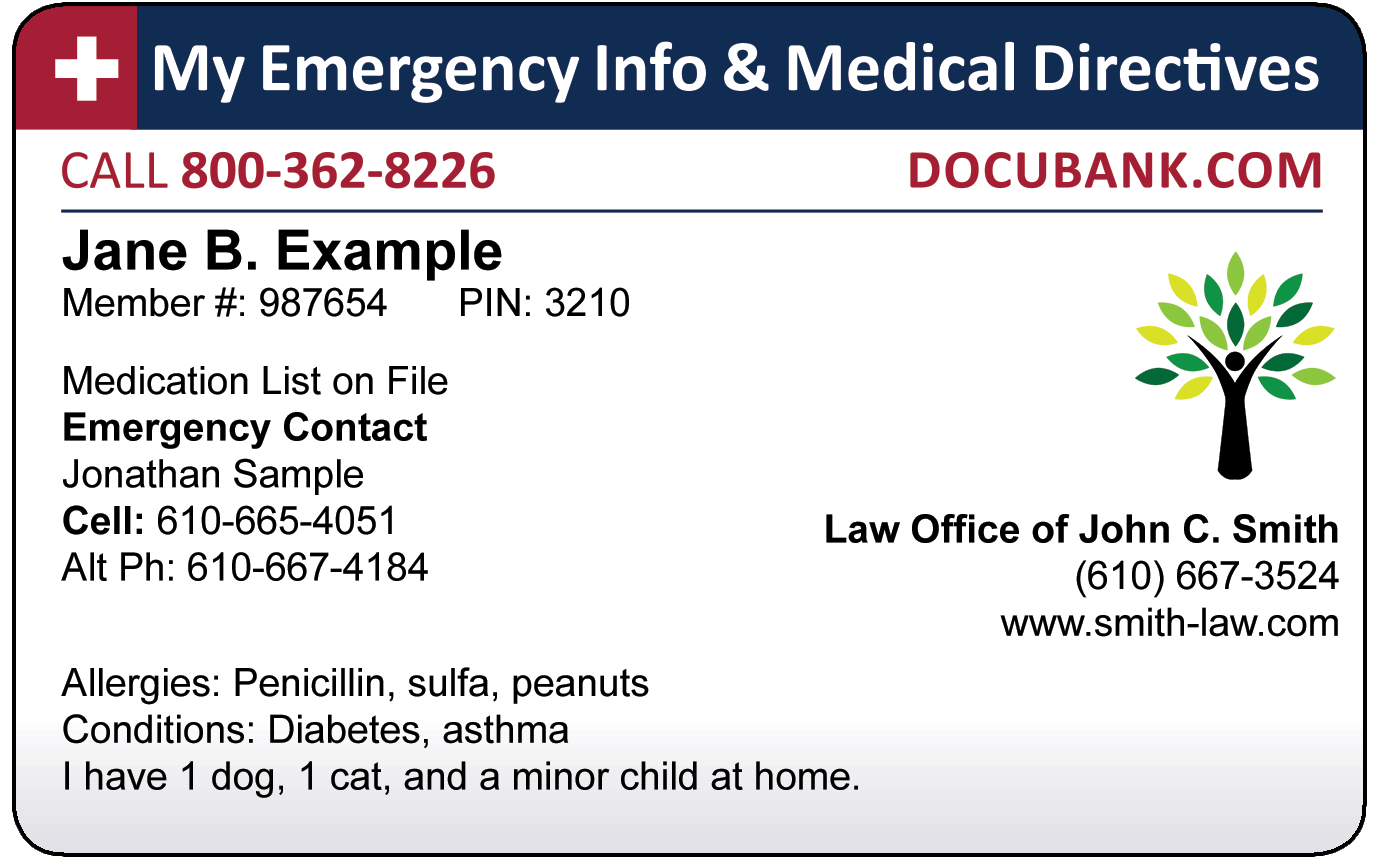 The DocuBank Card sends your clients' advance directives & vital medical information to doctors & hospitals. This reduces stress, clears up confusion, and helps clients receive the best care possible.