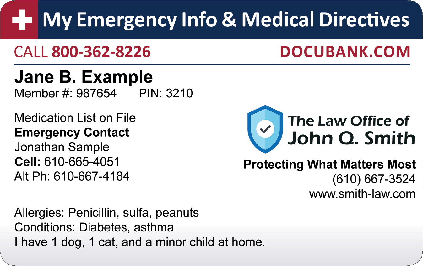The DocuBank Card sends your clients' advance directives & vital medical information to doctors & hospitals. This reduces stress, clears up confusion, and helps clients receive the best care possible.